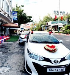 その後、白いウェディングカー(ボンネットに花束の装飾付き)に乗って披露宴会場へ向かいました。